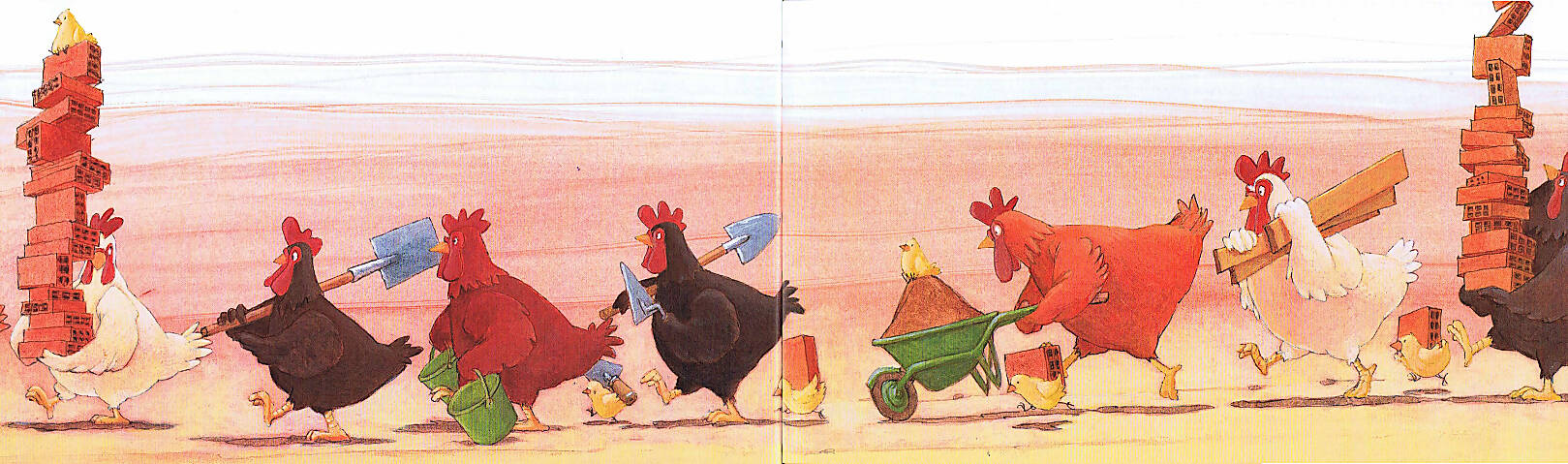 Im Hühnerhof erscheint plötzlich ein Igel. Alle beäugen ihn. Da rollt er sich zusammen. Über Nacht verschwindet er: Wie ein Dieb! Alle sind verunsichert und misstrauisch. Da bleibt nur Eines, sagt der Hahn: Wir müssen reagieren! Wir müssen eine Schutz-Mauer bauen!